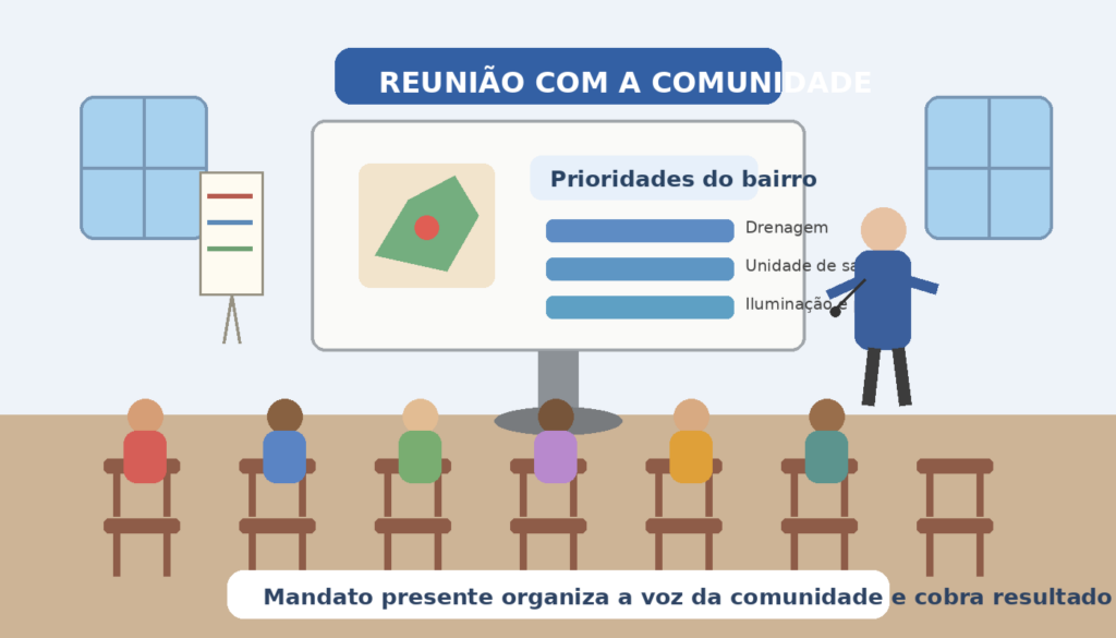 Mandato forte para periferia exige presença planejada. Não basta visita aleatória. É preciso calendário, retorno, escuta setorial e acompanhamento de pauta. A comunidade percebe quando a ida ao bairro foi só para foto. Também percebe quando o vereador conhece nome de rua, histórico da demanda e desdobramento do último pedido.