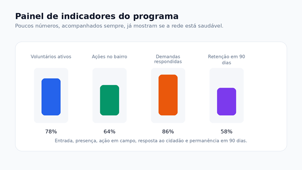 Os primeiros números que eu olho são simples. Quantos cadastrados chegaram no mês. Quantos passaram pela triagem. Quantos seguem ativos depois de trinta, sessenta e noventa dias. Em quais bairros há mais concentração. Quais frentes têm mais adesão. Quais ações geraram mais presença e mais retorno.