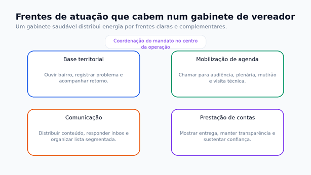 Eu gosto de trabalhar com quatro frentes simples. Base territorial, mobilização de agenda, comunicação e prestação de contas. A base territorial ajuda a ouvir bairro, organizar visita e mapear problema. A mobilização chama gente para plenária, audiência e reunião. A comunicação distribui informação com clareza. A prestação de contas ajuda a manter o vínculo vivo.