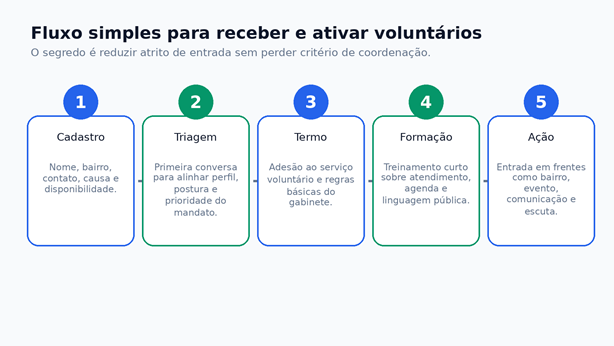 Um programa de voluntariado no mandato funciona quando ele respeita uma ordem simples. Primeiro você abre escuta. Depois você organiza entrada. Em seguida você forma, acompanha, presta contas e ajusta a rota. Parece básico, mas é justamente aí que os gabinetes mais sólidos se diferenciam.