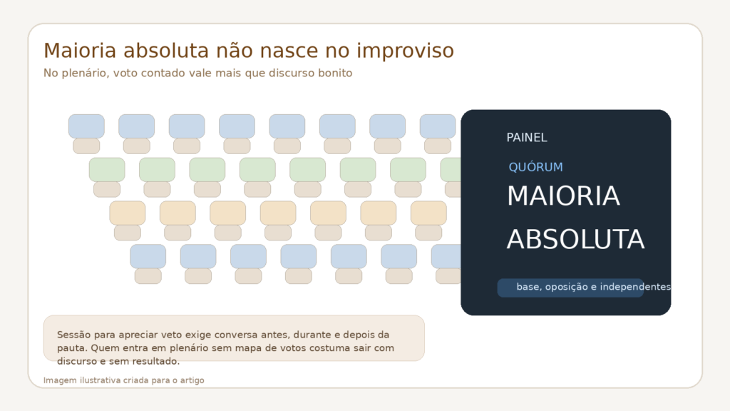 Chega então a hora em que muita gente acha que tudo se resolve no discurso. Não se resolve. Sessão de veto é sessão de contagem. O plenário é o lugar em que a técnica encontra o número. E número, aqui, é maioria absoluta para rejeitar o veto. No plano federal, a Constituição exige maioria absoluta em cada Casa para a rejeição, com votação nominal e ostensiva. A lógica municipal varia na forma, mas a maioria absoluta dos vereadores costuma ser a regra para derrubada.
