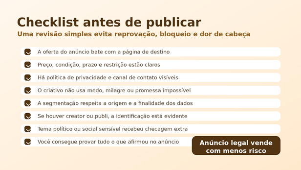 Na prática, vale usar um filtro simples antes de publicar. O anúncio faz promessa verificável? A peça deixa claro que há intenção comercial? O visual respeita o público sem explorar vulnerabilidade? A copy evita atributo pessoal e exagero absoluto? O clique leva para uma experiência coerente? Se essas respostas estiverem firmes, você já cortou uma parte relevante do risco.