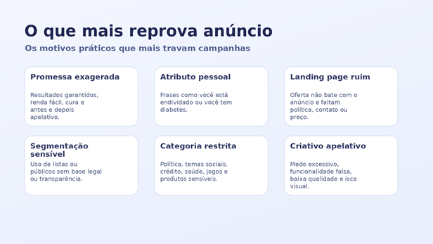 Muita conta é ferida no criativo antes mesmo de ter chance de mostrar valor. A razão é simples. O anúncio tenta roubar atenção com choque, medo, promessa absoluta ou insinuação pessoal. A Meta é especialmente sensível a peças que pressionam emocionalmente o usuário ou sugerem atributos pessoais, como saúde, dívida, aparência, condição emocional, religião ou outras características sensíveis. Não é detalhe de redação. É um ponto clássico de reprovação.