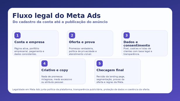 Imagem 1 — Fluxo legal do Meta Ads: cinco checagens que deveriam acontecer antes da publicação.