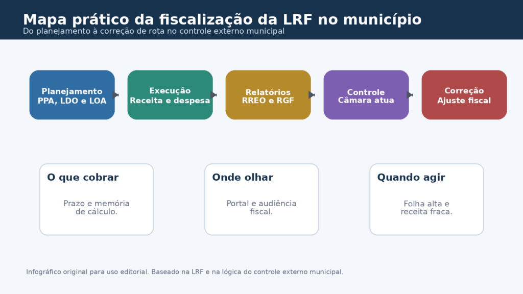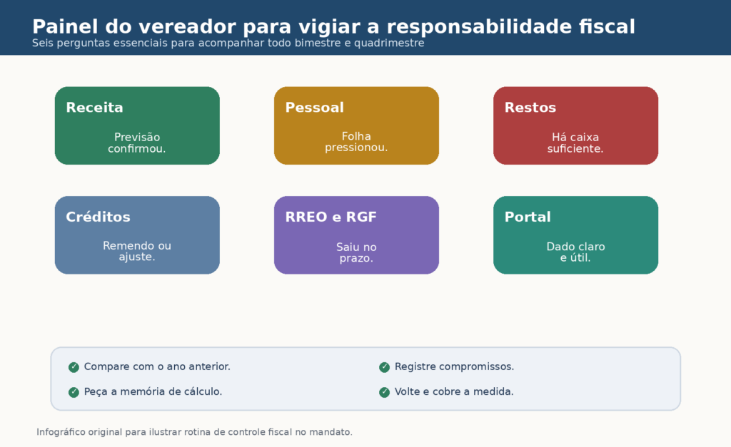 Nem todo vereador precisa ser contador. Mas todo vereador precisa saber montar método de leitura fiscal. A diferença entre mandato que fiscaliza e mandato que comenta está justamente aí. Comentário acompanha a manchete. Fiscalização acompanha a rotina do dado. Quando o gabinete organiza fluxo de acompanhamento, a LRF deixa de parecer um bloco de norma técnica e passa a funcionar como mapa de decisão política.