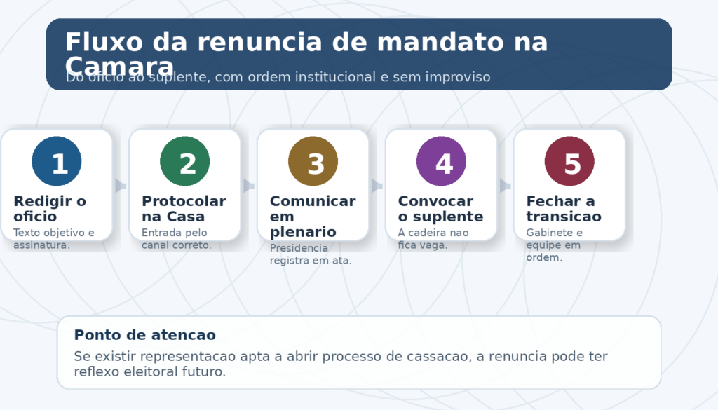Na prática, isso significa conferir modelo, assinatura, data e destinatário. O ideal é dirigir o expediente à Presidência da Câmara, identificar o mandato ao qual a renúncia se refere e pedir o regular processamento do ato. É simples. E justamente por ser simples não pode sair torto.