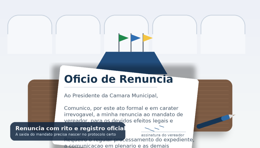 Assento de vereador não se larga no improviso. Em Câmara Municipal, renúncia é ato sério, com efeito imediato sobre mandato, suplência, gabinete, fala pública e futuro eleitoral. Quem trata isso como mera carta pessoal costuma criar mais problema do que solução.