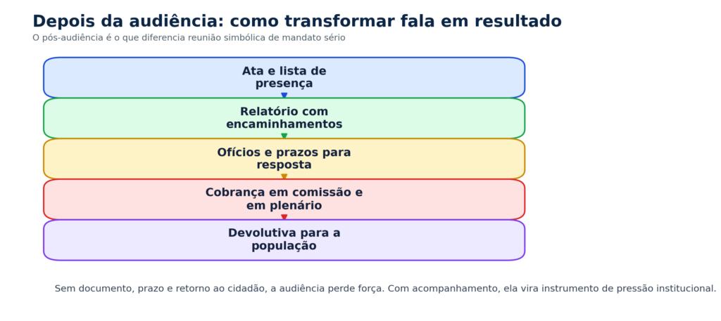 Em certos casos, pode ser necessário desdobrar a audiência em visita técnica, nova reunião setorial, pedido de fiscalização ou até convocação futura para prestação de contas. Isso não é exagero. É continuidade. Uma audiência pública bem feita muitas vezes inaugura uma linha de acompanhamento, e não um ato único. O erro é achar que uma reunião de duas horas dará conta de problema estrutural. Ela não dá. Mas ela pode organizar a pressão para que o enfrentamento comece.