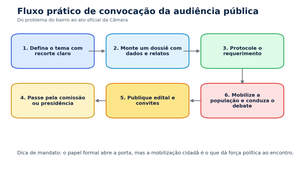 Também vale lembrar que a audiência nem sempre precisa acontecer apenas dentro do plenário tradicional. Dependendo do regimento e da natureza do tema, ela pode ser realizada em escola, centro comunitário, igreja, ginásio ou outro espaço que facilite o acesso popular. Em cidade grande ou em bairro afastado, isso muda tudo. Audiência feita longe do problema costuma falar para pouca gente. Audiência levada para perto da comunidade ganha presença, legitimidade e temperatura política.