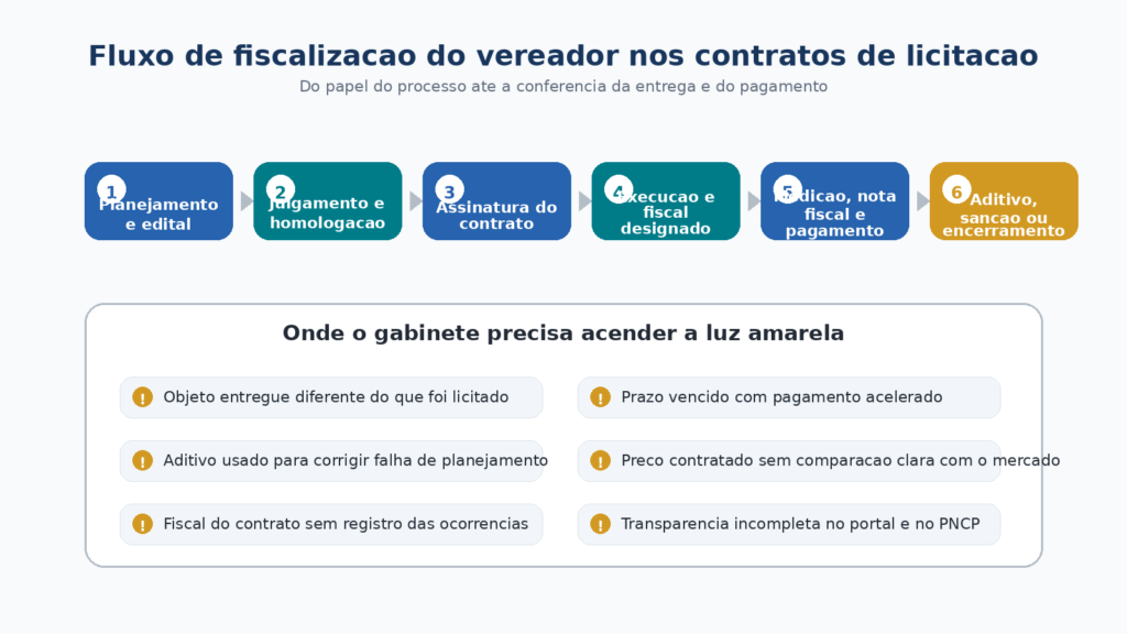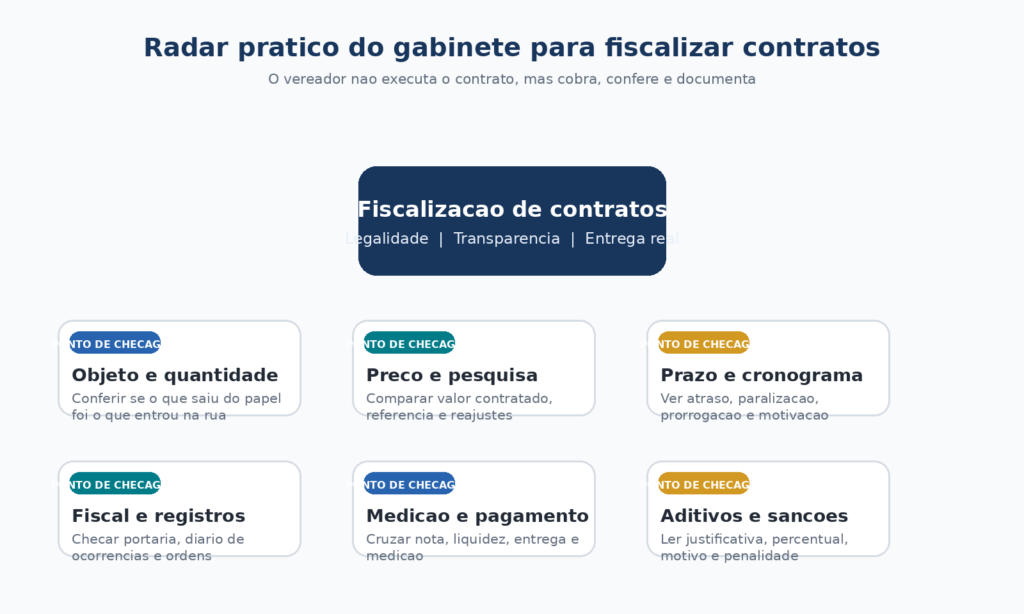 O vereador precisa desconfiar quando existe formalidade demais na entrada e escuridao demais na execucao. Sem relatorio de fiscal, sem registro de ocorrencias, sem medicao clara, sem imagem, sem conferencia de campo, o contrato vira caixa fechada. E contrato publico nao foi feito para ser caixa fechada. Ele foi feito para ser acompanhado pelo poder publico e pela sociedade.