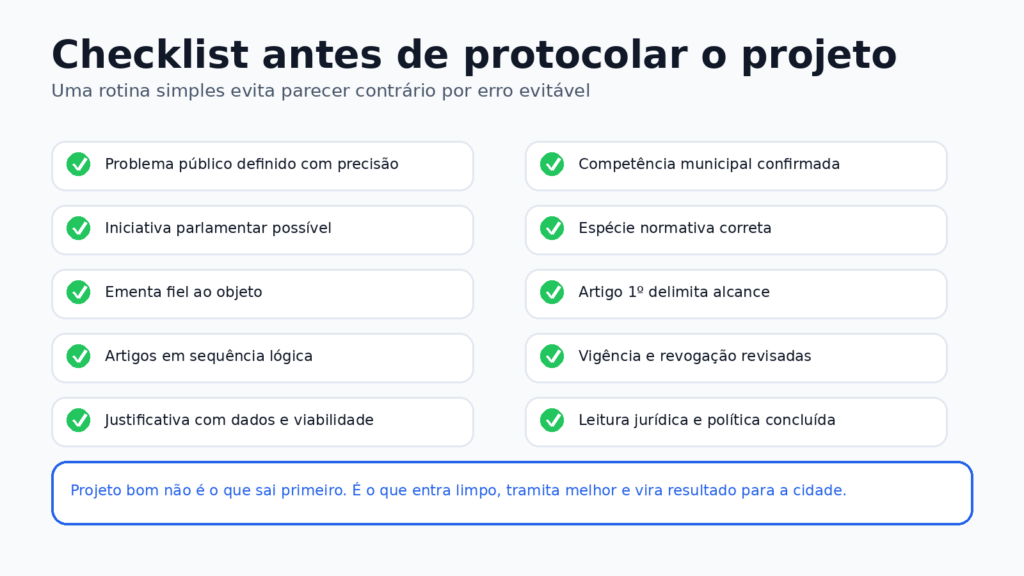 Esse checklist parece básico, mas salva projeto. Muitas vezes a equipe está tão focada no conteúdo político que esquece a costura técnica. E o protocolo prematuro cobra preço. Volta para correção. Recebe parecer duro. Gera ruído com a Procuradoria. Cria desgaste com liderança. Tudo isso seria evitável com uma última leitura disciplinada.