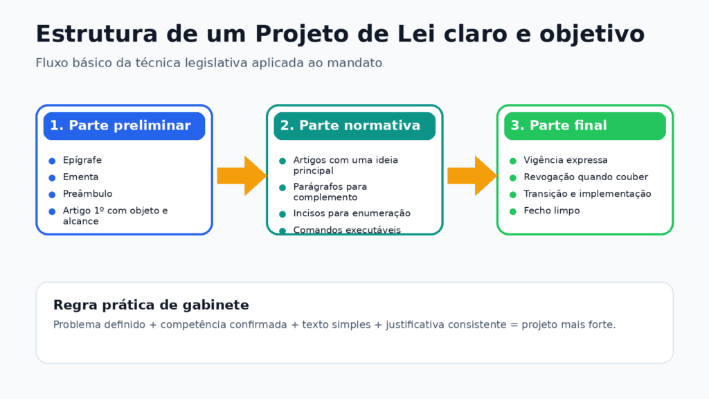 Depois de acertar a base, vem a arquitetura do texto. Aqui não tem milagre. Existe técnica. A Lei Complementar 95 de 1998 é o eixo federal da elaboração e da redação legislativa, e continua sendo a referência mais importante para organizar a estrutura das leis. Quando eu digo ao cliente do mandato para respeitar a forma, não é por formalismo vazio. É porque forma ruim confunde conteúdo bom.
