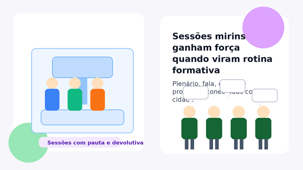Sessão mirim boa não é aquela em que o plenário parece uma cópia caricata da Câmara adulta. Sessão boa é aquela em que o estudante entende o rito, participa com segurança e debate temas que fazem sentido para sua vivência. Isso exige pauta bem escolhida. Segurança no entorno escolar, acessibilidade, esporte, cultura, meio ambiente, bullying, iluminação, trânsito e conservação de espaços públicos costumam gerar proposições muito mais conectadas com a realidade do que assuntos abstratos demais.