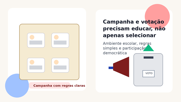 Ilustração 2. Campanha e votação precisam ensinar democracia com regras simples e ambiente seguro.