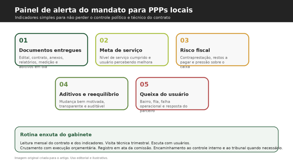Se eu estivesse estruturando um gabinete para acompanhar PPP local hoje, começaria por um painel mensal simples. Não um sistema mirabolante. Um painel com contrato, objeto, valor, prazo, fase atual, indicadores-chave, pagamentos, glosas, notificações, pedidos de reequilíbrio, aditivos, reclamações recorrentes e pendências documentais. Isso cabe numa rotina de assessoria bem organizada e muda completamente a qualidade das intervenções do mandato.