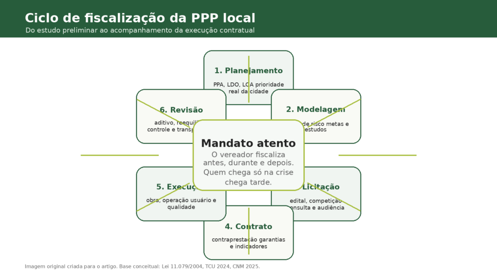O artigo do IBPOM ajuda bem nesse ponto porque puxa a fiscalização para o chão da Câmara. Comissão, requerimento, convocação, acompanhamento de recursos, diligência e, nos casos graves, CPI. Tudo isso existe no universo municipal. O desafio é encaixar essas ferramentas no ciclo da PPP sem cair nem no espetáculo nem na omissão.