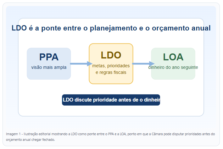 Imagem 1 – Ilustração editorial mostrando a LDO como ponte entre o PPA e a LOA, ponto em que a Câmara pode disputar prioridades antes do orçamento anual chegar fechado.