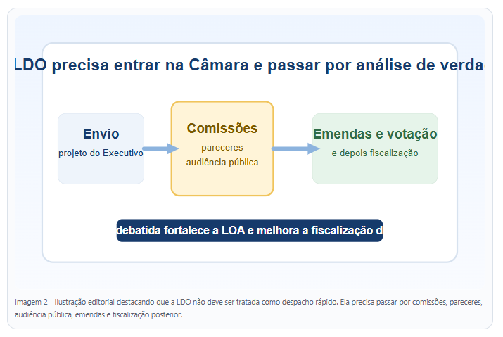 Imagem 2 – Ilustração editorial destacando que a LDO não deve ser tratada como despacho rápido. Ela precisa passar por comissões, pareceres, audiência pública, emendas e fiscalização posterior.