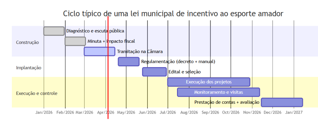 Mermaid timeline do ciclo típico de vida de uma lei municipal de incentivo ao esporte: