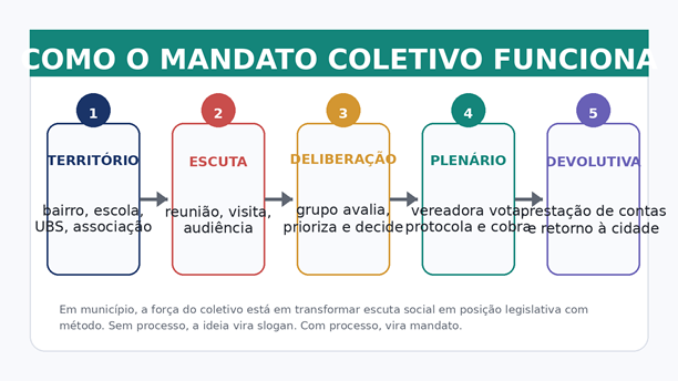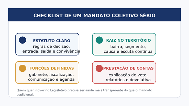 Se eu tivesse que resumir em uma frase de gabinete, eu diria assim: mandato coletivo é um arranjo político em que a legitimidade nasce do grupo, mas a responsabilidade formal continua concentrada na pessoa eleita. Quem entende essa chave já entende metade do assunto. A outra metade está no funcionamento diário. E é justamente aí que muita candidatura tropeça, porque não basta posar de moderna. É preciso saber como organizar processo decisório, agenda pública, equipe, comunicação, relação com partido, presença em plenário e prestação de contas.