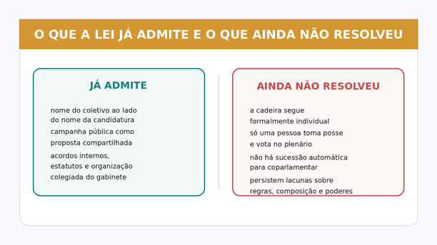 Aqui é preciso falar reto, porque muita confusão nasce justamente da falta de clareza jurídica. O Brasil ainda não transformou o mandato coletivo em figura plenamente regulamentada do jeito que muitos defendem. Houve avanços na forma de apresentação das candidaturas, especialmente no nome de urna, mas a estrutura legal continua assentada na candidatura individual. Isso significa que o coletivo existe politicamente, pode ser informado ao eleitor, pode orientar o exercício do mandato, mas não substitui a pessoa que responde formalmente pela cadeira.