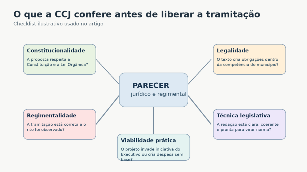 Quando a comissão faz esse trabalho com seriedade, ela evita um problema muito comum no Legislativo municipal: aprovar ideia simpática, mas juridicamente frágil. Isso acontece bastante em projetos que tentam criar atribuições para secretarias, ampliar gastos sem previsão ou disciplinar tema que já está reservado ao prefeito. A CCJ não age contra a ideia boa. Ela age contra o erro de forma.