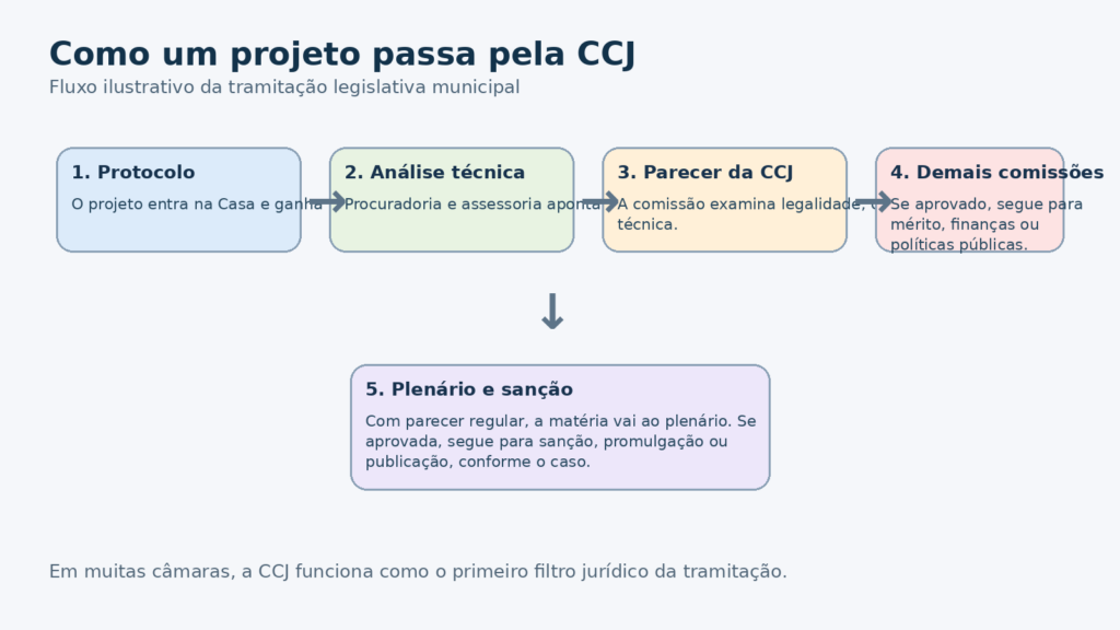 Em algumas Câmaras, como a de Maringá, a notícia institucional explica que, após a CCJ, os projetos podem seguir para comissões como Finanças e Orçamento e Políticas Gerais, cada uma com foco diferente. Isso mostra algo importante: a CCJ não substitui o debate de mérito. Ela prepara o terreno para que o mérito seja discutido com segurança.