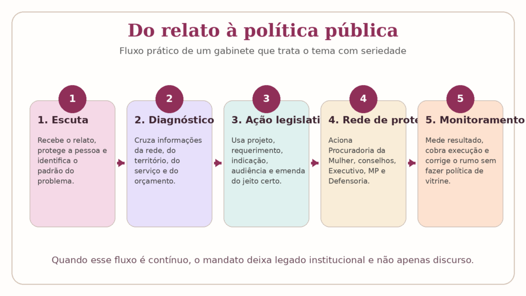 Outro ponto importante é organizar essa escuta. Gabinete que leva o tema a sério registra padrões, separa demandas individuais de problemas estruturais, identifica território, horário, serviço envolvido e frequência do relato. Isso permite sair do campo da impressão e entrar no campo do diagnóstico. Quando aparecem denúncias recorrentes sobre assédio em determinada linha de ônibus, falhas de acolhimento em certa unidade ou ausência de informação em equipamentos específicos, o mandato ganha base para atuar com firmeza. Sem organização, a escuta vira acúmulo de histórias. Com organização, ela vira agenda pública.