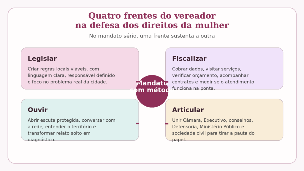 A primeira obrigação de quem trata desse assunto com seriedade é não vender ilusão. Vereador não é delegado, não é juiz, não é secretário municipal e não é prefeito. Ele não decreta prisão, não concede medida protetiva, não executa programa sozinho e não pode prometer o que a competência do cargo não entrega. Esse esclarecimento é importante porque boa parte da frustração popular nasce justamente de promessas feitas sem responsabilidade institucional. Na defesa dos direitos da mulher, isso é ainda mais grave, porque falsas expectativas podem afastar pessoas da rede correta de proteção.