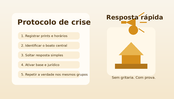 Mesmo com prevenção, uma hora o ataque pode vir. Nessa hora, o vereador precisa trocar emoção por método. Raiva é compreensível. Pressa sem critério é perigosa. O que protege o mandato é um protocolo claro, conhecido pela equipe e acionado sem drama. Boato se enfrenta com sangue-frio, prova e linguagem cirúrgica.