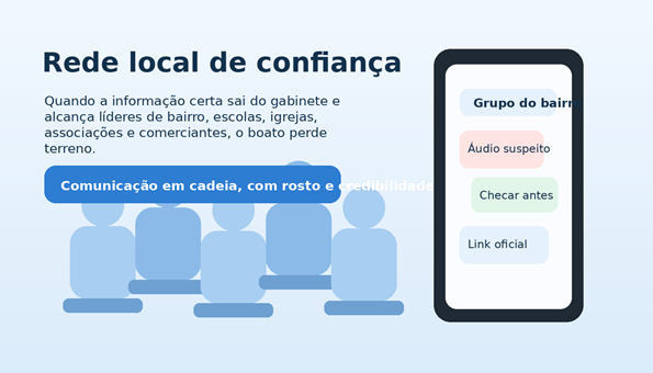 Figura 2 — Rede local de confiança: o combate ao boato fica mais forte quando a informação oficial caminha junto com lideranças respeitadas na comunidade.