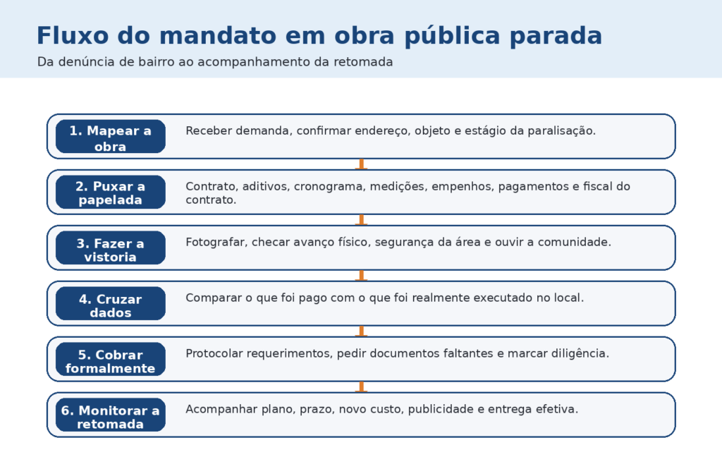Fiscalização boa não termina no diagnóstico. Ela precisa apontar saída e acompanhar a execução da saída. É aqui que o vereador se diferencia do comentarista do caos. Depois de mostrar a falha, o mandato deve cobrar plano de retomada, transparência, reprogramação responsável e entrega efetiva. Se a obra ficar só na fase da denúncia, a população até reconhece coragem, mas continua sem equipamento público funcionando.