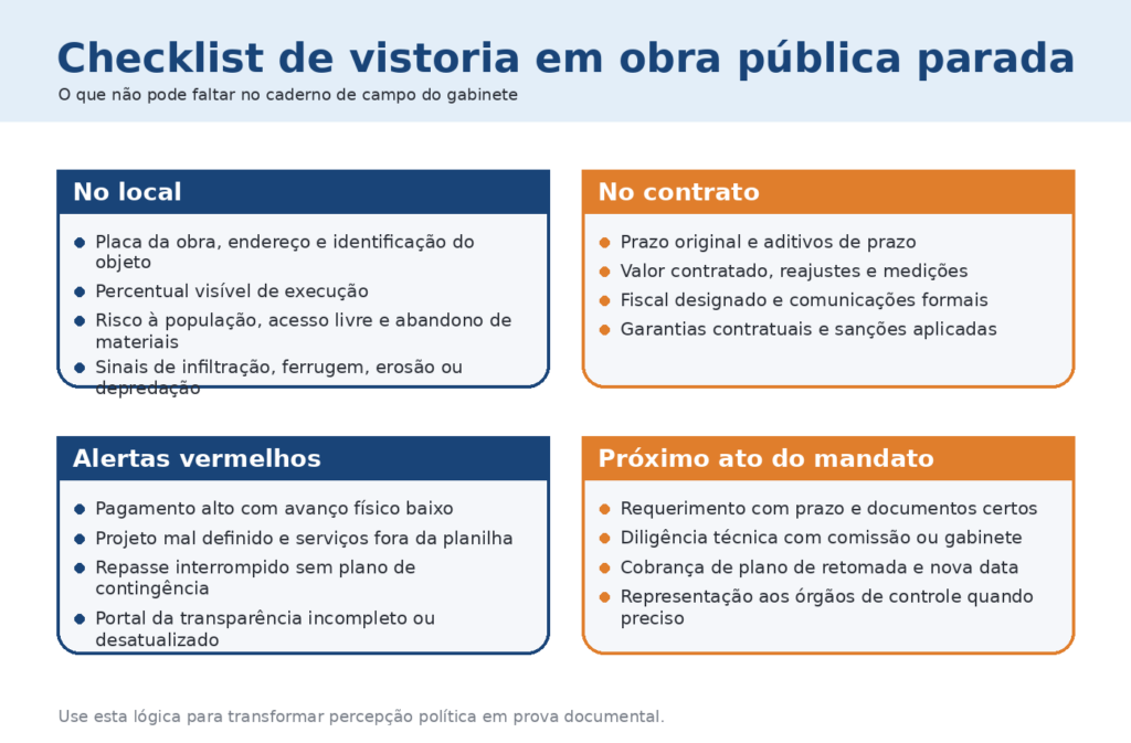 Por isso a diligência precisa ter roteiro. Não é necessário transformar o vereador em perito, mas é indispensável ir com foco. Quem está presente. Quem responde pela unidade. Há placa da obra. O percentual visual é compatível com a última medição. Existe risco de acidente. Há marca de paralisação recente ou abandono prolongado. Quanto mais organizada for a visita, melhor será o uso político e institucional do resultado.