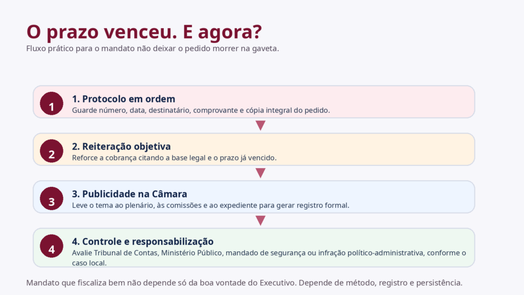 Eu sempre recomendo tratar o vencimento do prazo como marco processual do mandato. Algo aconteceu ali. A partir daquele dia, muda o estado da cobrança. O pedido deixa de ser mera solicitação pendente e passa a ser solicitação potencialmente inadimplida. Essa mudança precisa aparecer no modo como o gabinete escreve, comunica e arquiva.