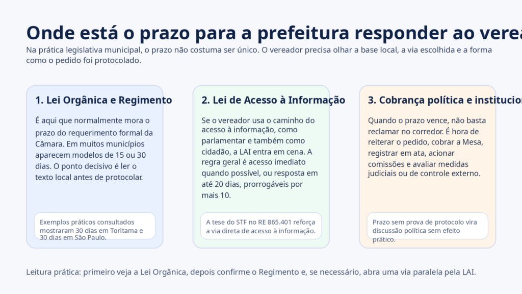 No dia a dia do plenário, a resposta correta quase nunca é um número solto. Em um município, a Lei Orgânica fala em quinze dias. Em outro, o texto local fixa trinta. Em certas situações, o Regimento traz o caminho formal pela Mesa. Em outras, o vereador também pode acionar a Lei de Acesso à Informação como cidadão e parlamentar. Se você mistura essas trilhas, acaba cobrando errado e perde tempo.