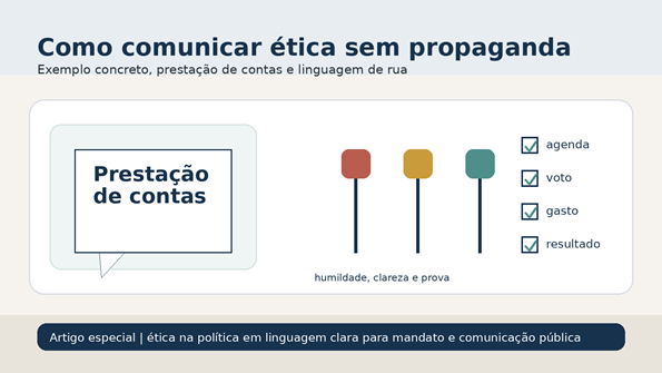 Esse ponto interessa muito para mandato. Muita gente sabe que precisa falar de ética, mas escorrega no tom. Ou cai no moralismo vazio, que soa artificial, ou cai na autopromoção, que gera rejeição imediata. A saída é tratar ética como prática verificável. Menos pose. Mais exemplo. Menos frase decorada. Mais processo explicado com humildade e com prova.