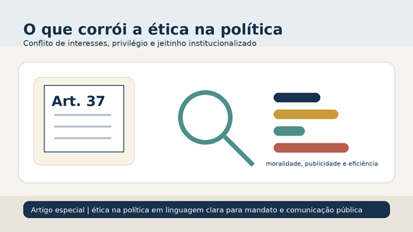A Constituição colocou no centro da administração pública os princípios de legalidade, impessoalidade, moralidade, publicidade e eficiência. Isso é fundamental para entender ética na política. Não basta fazer algo dentro da lei em sentido estreito se o ato fere a moralidade administrativa, distorce a finalidade pública ou esconde informação relevante da sociedade.