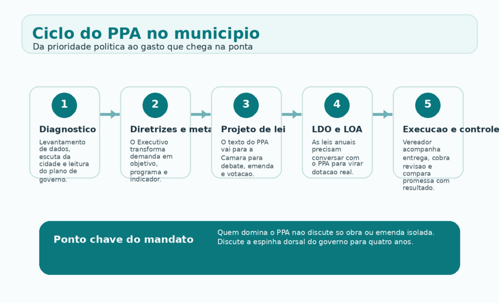 O Plano Plurianual e o documento que diz, em linguagem de lei, para onde a cidade pretende andar. Por isso, o vereador que compreende o PPA deixa de ser espectador de planilha e passa a ser agente real da definicao de prioridades. Ele sabe onde pressionar, onde emendar, onde fiscalizar e onde explicar para a populacao o que esta em jogo.