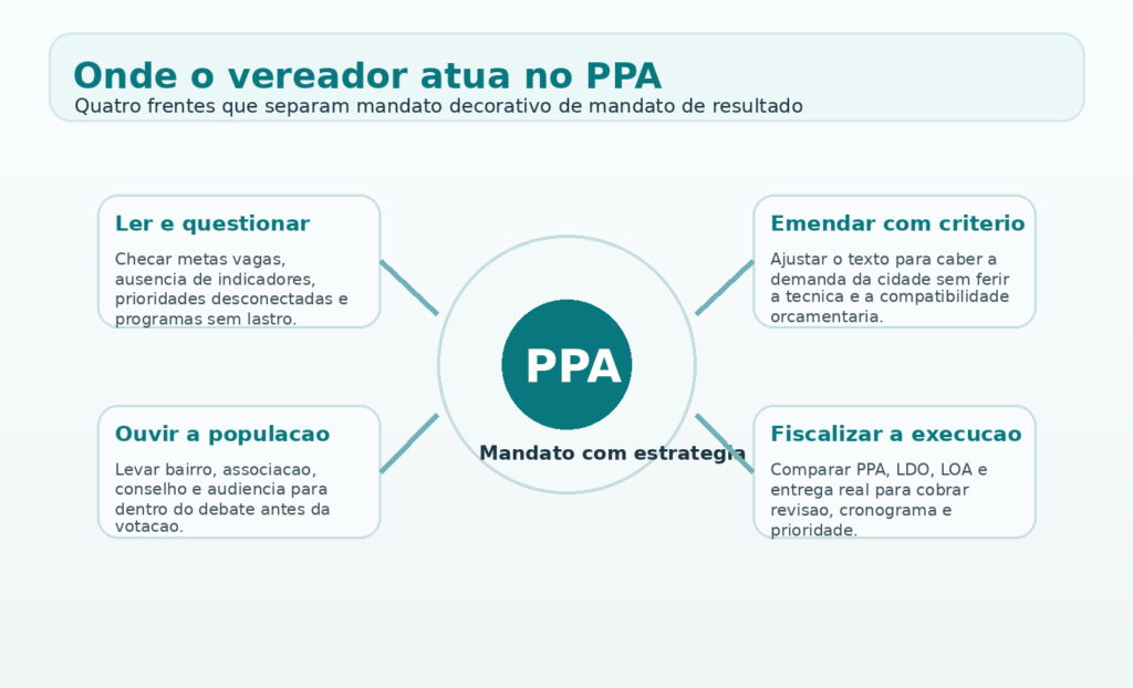 Tem gente que reduz a atuacao do vereador no PPA a fazer emenda. Isso e pouco. O papel comeca antes da emenda e continua depois do voto. O vereador atua lendo, questionando, propondo ajuste, ouvindo a cidade, negociando prioridade, explicando o processo e, mais adiante, fiscalizando se aquilo que entrou no plano apareceu nas pecas anuais e nas entregas concretas. O mandato que se limita a protocolar emenda sem compreender o conjunto trabalha com pouca profundidade.