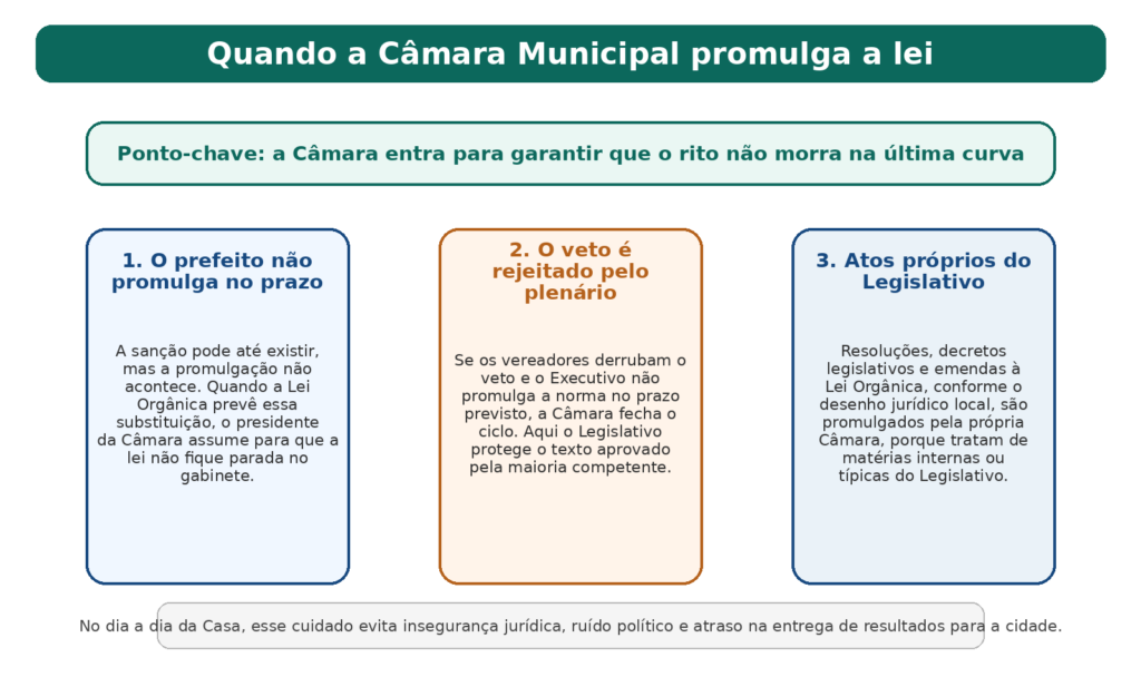 Quando se fala em promulgação pela Câmara Municipal, estamos tratando das hipóteses em que o próprio Legislativo assume essa etapa. Isso pode acontecer porque a Lei Orgânica do município prevê a substituição do Executivo em caso de omissão, porque houve rejeição de veto pelo plenário, ou porque o ato normativo já é, por natureza, típico da própria Câmara, como ocorre com resoluções e, conforme o regime local, outros atos internos.