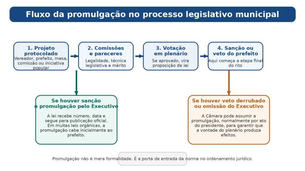 Na prática legislativa, a promulgação funciona como a ponte entre a aprovação política e a existência normativa. O projeto pode ter sido debatido, recebido parecer, passado por comissão, vencido discussão em plenário e até superado veto. Ainda assim, sem a etapa final correta, você não tem a mesma segurança para dizer que a lei entrou no sistema jurídico do município da forma devida.
