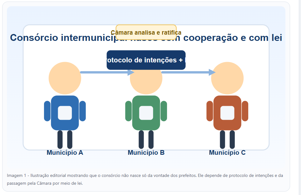 Imagem 1 – Ilustração editorial mostrando que o consórcio não nasce só da vontade dos prefeitos. Ele depende de protocolo de intenções e da passagem pela Câmara por meio de lei.