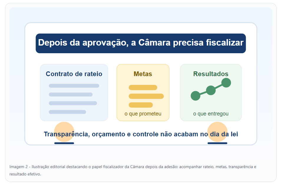 Imagem 2 – Ilustração editorial destacando o papel fiscalizador da Câmara depois da adesão: acompanhar rateio, metas, transparência e resultado efetivo.