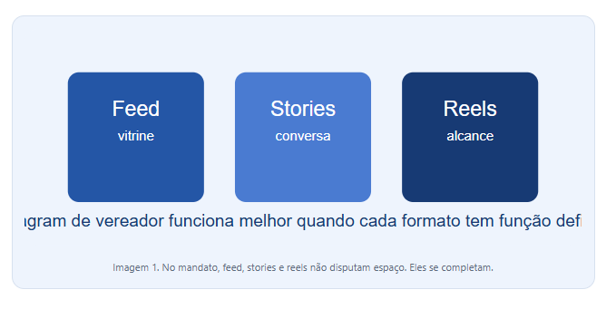 Feed organiza reputação. Stories constroem proximidade. Reels ampliam alcance. Quando o gabinete entende essa divisão, o Instagram deixa de ser correria e vira estratégia.