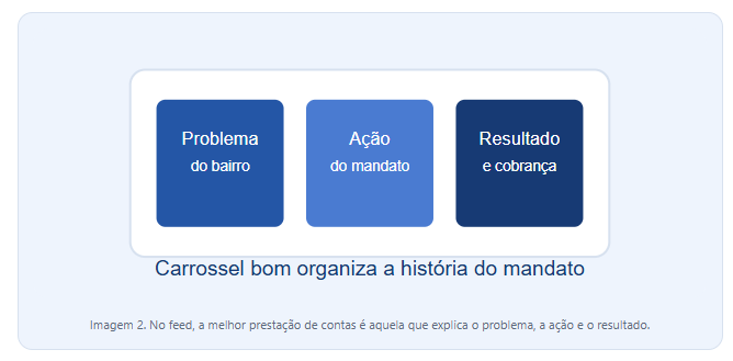 Dá para usar carrossel para muita coisa boa. Mostrar antes e depois de uma demanda. Explicar por que certo projeto impacta o bairro. Detalhar o caminho de uma indicação ao Executivo. Ensinar como acessar serviço público. Quebrar fake news local. Resumir uma audiência pública. Mostrar números do mandato sem transformar tudo em autopromoção.