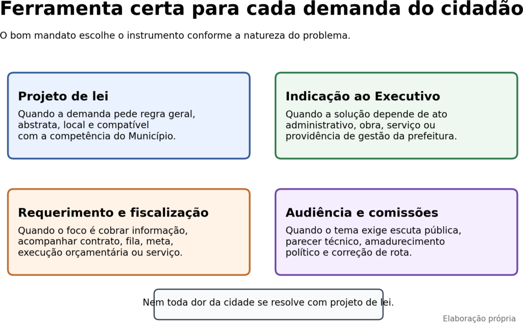 Aqui está a parte mais útil para quem vive a política municipal de perto. A população apresenta problema concreto. O gabinete recebe a demanda. O vereador quer agir. O que fazer para não errar o instrumento? Essa pergunta separa o mandato técnico do mandato improvisado.