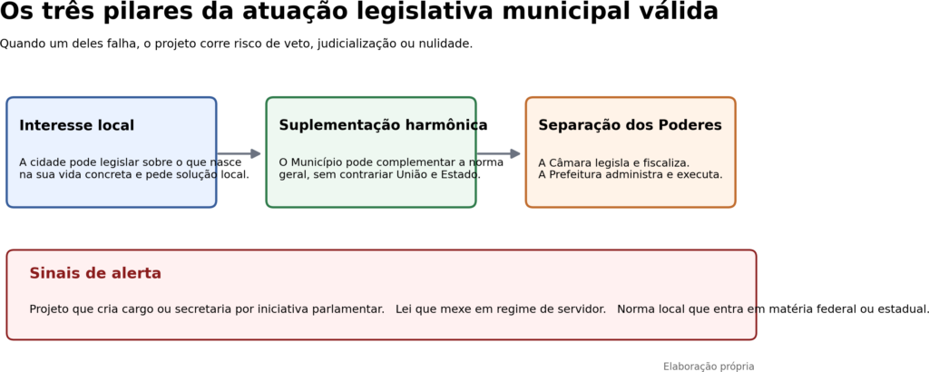 Interesse local não é um enfeite retórico para colocar na justificativa do projeto. É o primeiro teste de sobrevivência da proposta. Quando eu vejo um texto entrar na Casa, a pergunta inicial é simples. Esse assunto nasce no cotidiano da cidade e pede resposta normativa local, ou o vereador está tentando resolver por lei municipal algo que a Constituição já entregou para outro ente.
