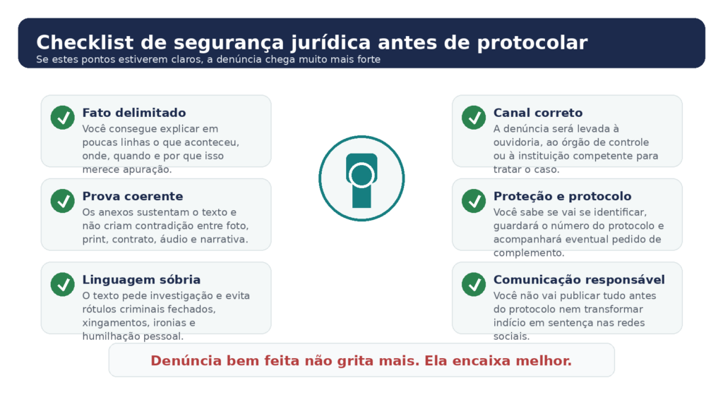 A denúncia forte é aquela que chega com aparência e substância de seriedade. Ela entra pelo caminho correto, descreve o fato com precisão, junta material pertinente, respeita os limites da linguagem e cobra apuração sem antecipar condenação. Esse conjunto reduz risco e aumenta efetividade.[4][5][6][8]