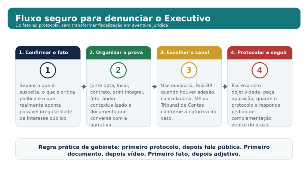 Se eu tivesse que resumir tudo isso numa fala de gabinete, eu diria assim. Denuncie firme, mas denuncie limpo. Limpo de exagero. Limpo de adjetivo inútil. Limpo de vingança pessoal. Limpo de prova desorganizada. Limpo de canal errado.