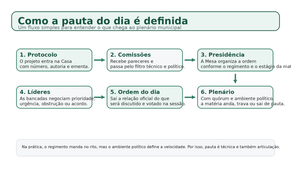 Eu gosto de explicar assim: no município, a pauta é onde o regimento encontra a política. De um lado, há regra, rito, turno, parecer, prazo e forma. Do outro, há interesse de governo, pressão social, acordo de bancada, resistência de oposição e leitura de ambiente. A pauta nasce exatamente desse encontro. Por isso ela nunca é uma folha neutra. Ela é um documento técnico, mas também é um documento político.